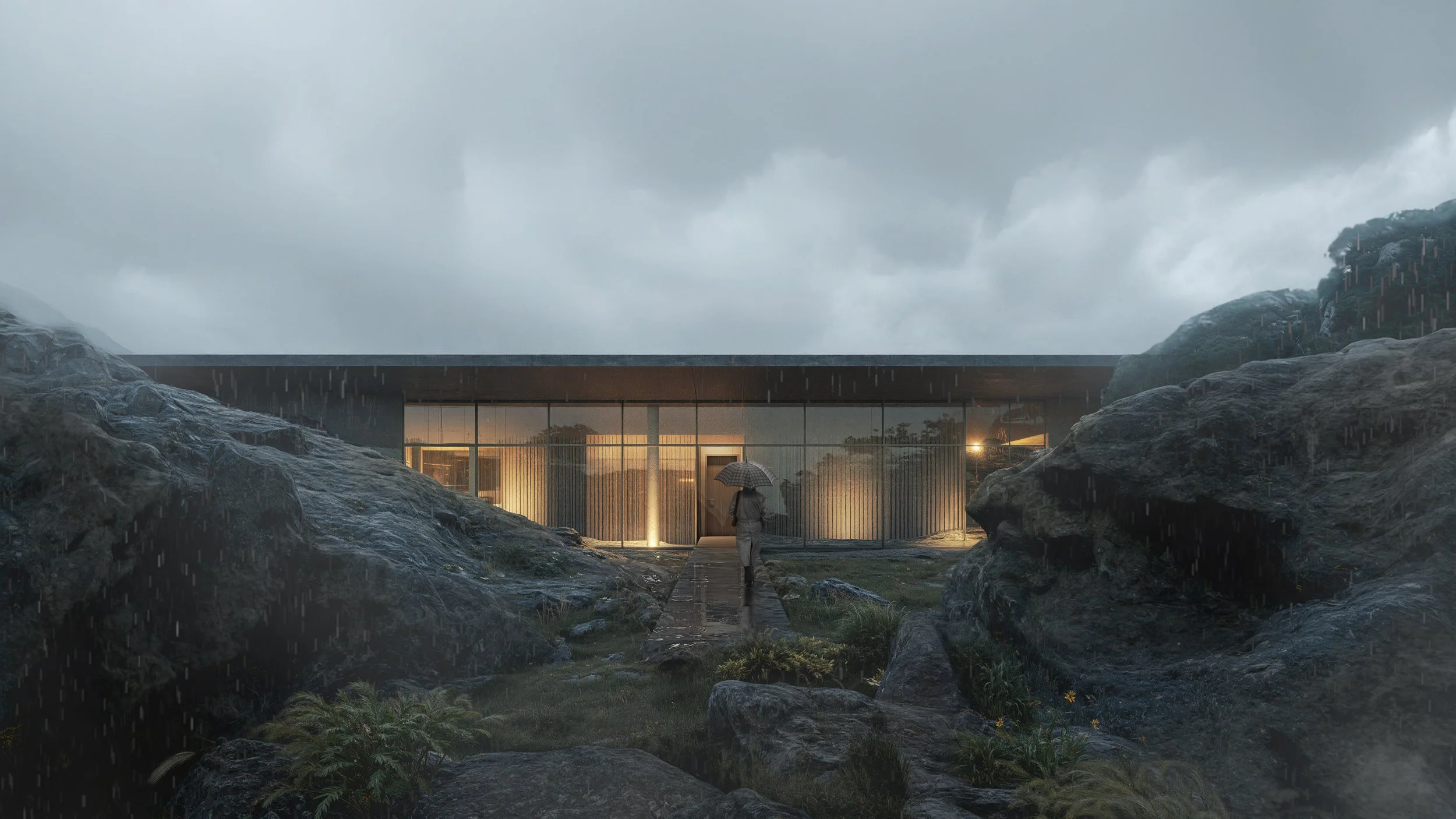 Here, people do not inhabit a building, but “walk into themselves.” We design a sequence of spaces that awakens the six senses and the body’s intuitive response to the environment. Responding to the extreme climate with minimal intervention, the project utilizes thickened shipping containers and GFRC panels—lightweight, recyclable elements that evoke the essential “primitive hut.”