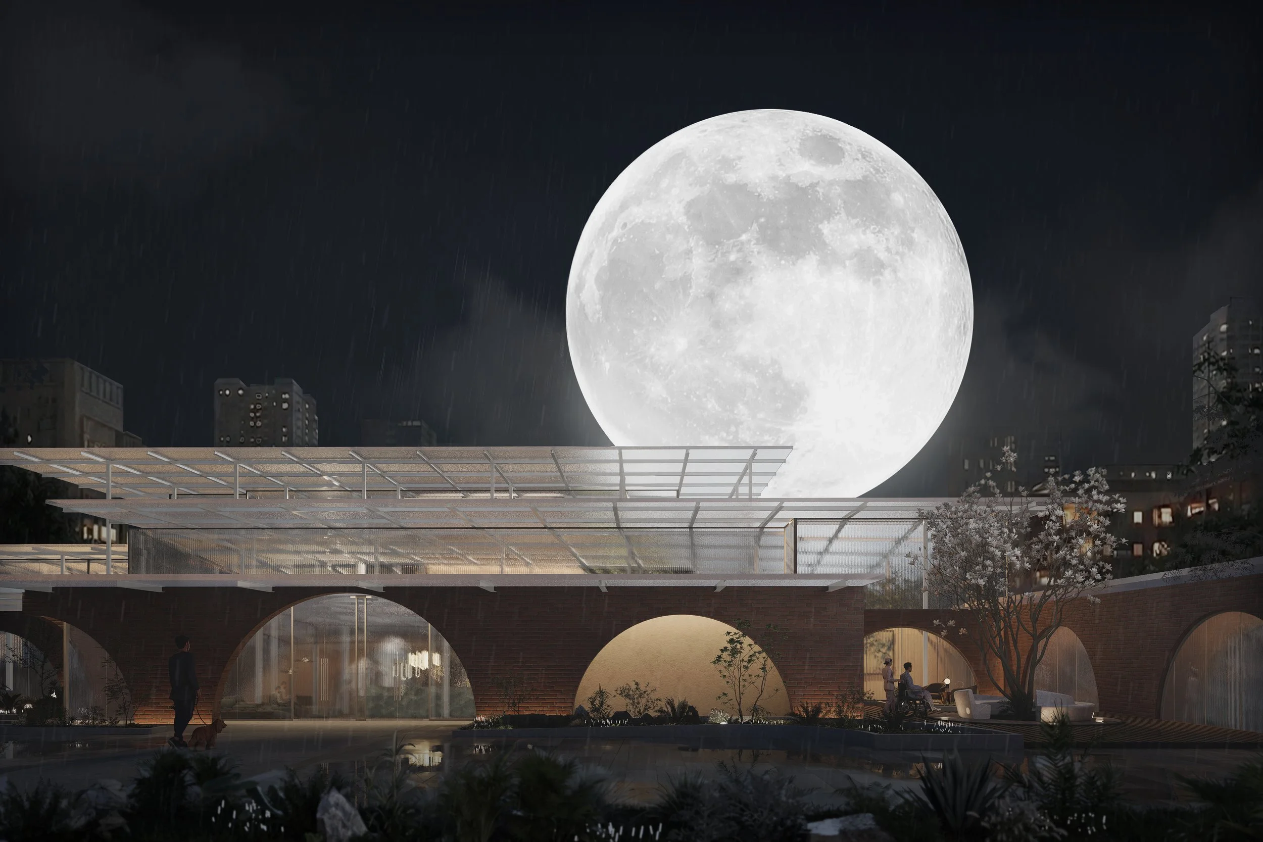 The design features three concentric rings: a core of nature-integrated private units under a translucent roof, a circulation ring for families, and an outer public layer housing a kindergarten and library to bridge generations. Constructed with "bone bricks" from local waste, the project proposes a dignified, intergenerational model that reintegrates life’s final chapter with the everyday.
